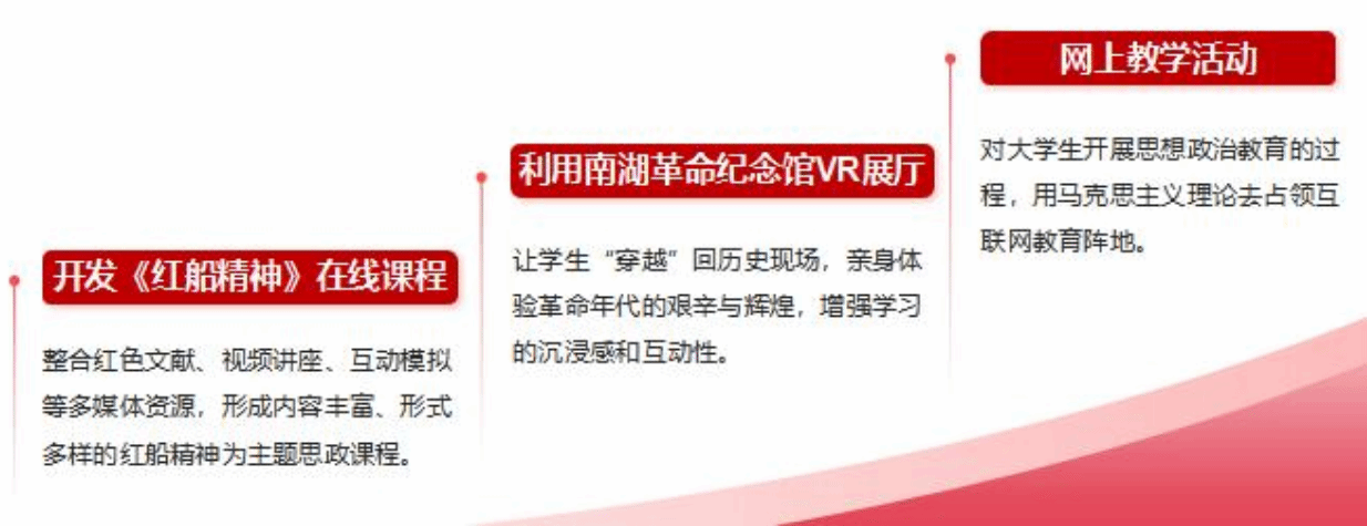開發《紅船精神》在線課程,整合紅色文獻、視頻講座、互動模擬等多媒體資源,形成內容豐富、形式多樣的紅船精神為主題思政課程,學生在高校思政課教學中重溫歷史,感受紅色精神的傳承,增強學習的沉浸感和體驗感。利用南湖革命紀念館 VR 展廳等網絡資源,讓學生“穿越”回歷史現場,親身體驗革命年代的艱辛與輝煌,增強學習的沉浸感和互動性。組織學生在網上通過“網上觀影”、“網上閱讀”、“網上討論”等一系列網上教學活動,對大學生開展思想政治教育的過程,用馬克思主義理論去占領互聯網教育陣地。