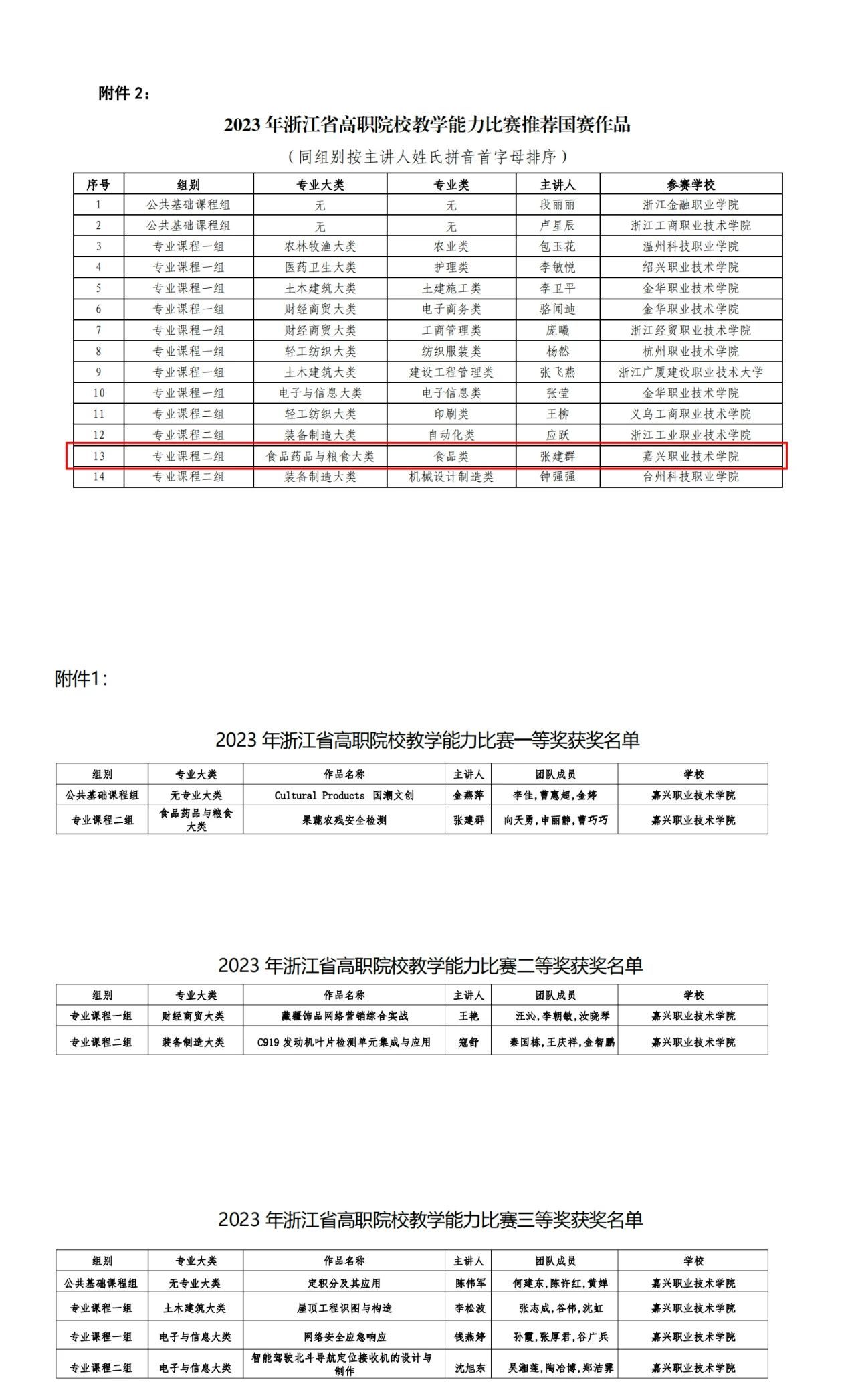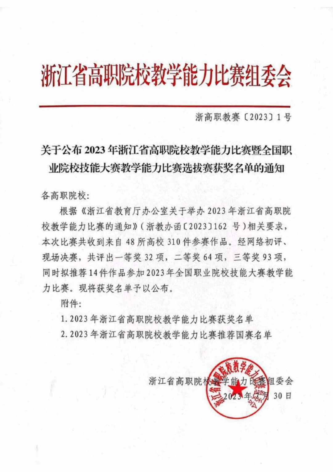 據(jù)悉,浙江省高職院校教學(xué)能力比賽是代表省內(nèi)高職院校教學(xué)能力最高水平的權(quán)威賽事,本屆比賽共有48所高職院校參賽,在各高職院校選送的310件作品中,經(jīng)網(wǎng)絡(luò)初審和現(xiàn)場決賽,評選出一等獎32項、二等獎64項、三等獎93項,并推薦14項優(yōu)秀作品代表浙江省參加2023年全國職業(yè)院校教學(xué)能力比賽。