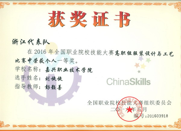 一分耕耘一分收獲。今年5月22日,在杭州職業技術學院舉行的2016年全國職業院校技能大賽便是最好的回報。來自全國25個省市53所高職院校的85名省賽優秀選手參與國賽的角逐。大賽以技能考核為主,兼顧理論考試評定,主要考核參賽選手的服裝創意設計、服裝拓展設計、立裁造型等項目內容。劉旋旋同學在11個小時高強度的賽程中沉著應戰、奮勇拼搏,充分展示了嫻熟的操作技能、高超的應變能力和良好的職業風貌,最終以獨特創新的設計理念、出色的服裝畫表現、精湛的立裁制作技壓群雄,獲得國賽一等獎的好成績,同時獲得“全國紡織服裝專業學生職業技能標兵”、“服裝技師”稱號,彭顥善老師榮獲全國職業院校服裝設計技能大賽優秀指導教師獎。
