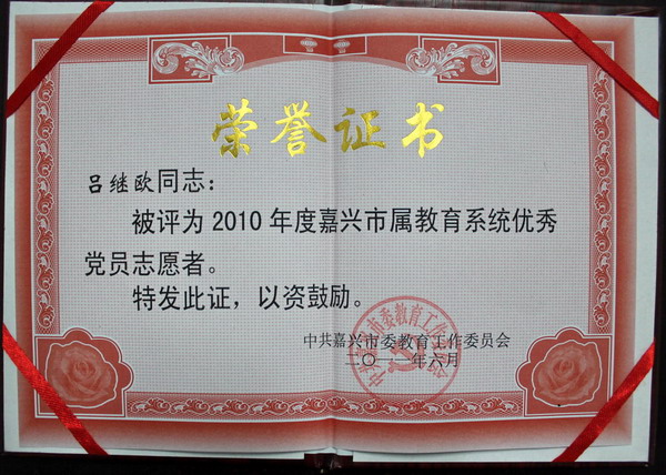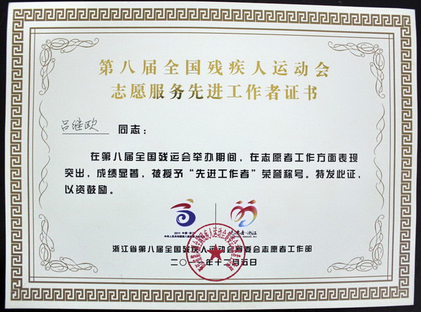 2016年,他被省教育廳、省人社廳和財(cái)政廳授予浙江省省級優(yōu)秀教師暨省高校優(yōu)秀輔導(dǎo)員;2013年,他被嘉興市委、市政府評為嘉興市“第八屆全國殘疾人運(yùn)動會籌備工作先進(jìn)個人”;2010年,他被評為嘉興市屬教育系統(tǒng)優(yōu)秀黨員志愿者;他還多次被評為嘉興職業(yè)技術(shù)學(xué)院先進(jìn)德育工作者、優(yōu)秀班主任、優(yōu)秀黨務(wù)工作者等榮譽(yù)稱號。