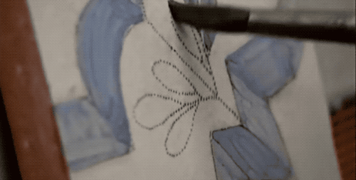 重頭戲表面上彩,要先畫上有序的幾何圖形,用的辦法在咱們小時候應該都玩兒過...在一張透明卡紙上畫出幾何形狀來,而后沿著線條戳出一個個的小孔,把它做為模板。當模板卡紙覆蓋到花磚上,且對好方向后,用沾了墨粉的筆刷一掃,素胚上就有輪廓圖了~小心填色