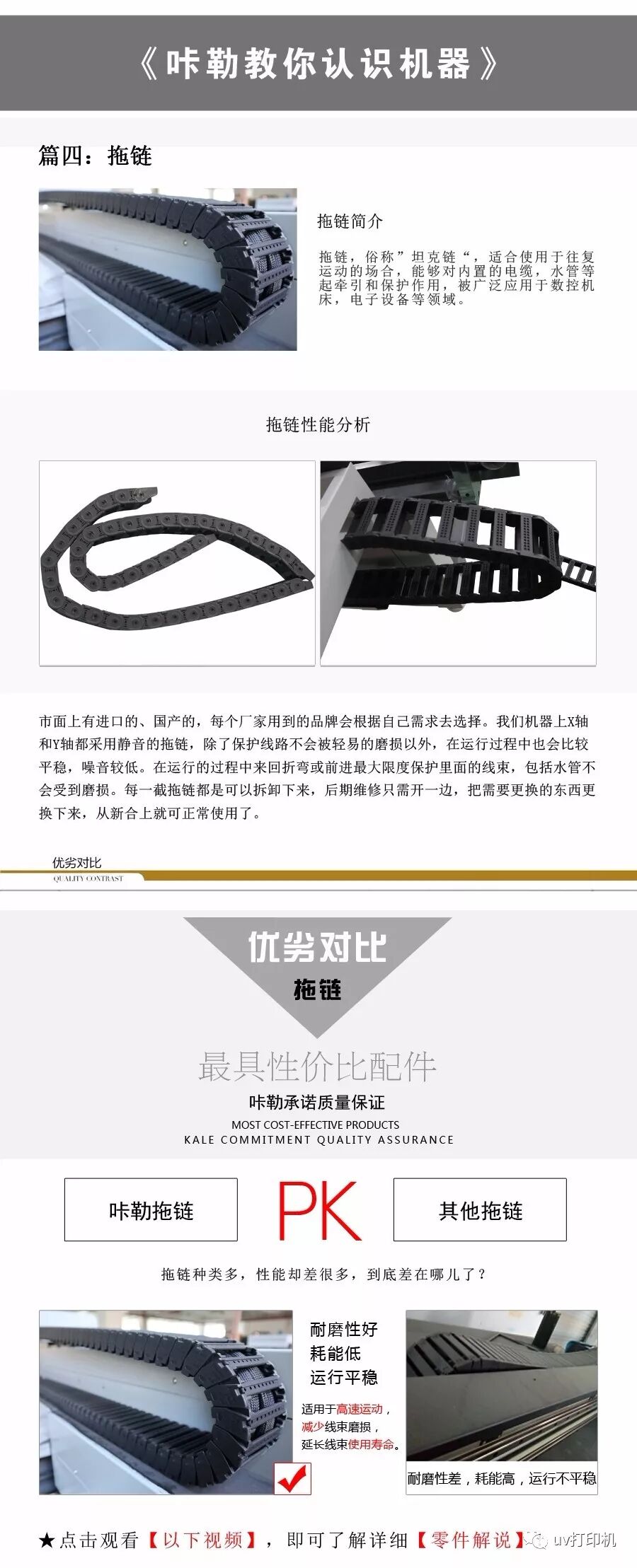 市面上有進口的、國產兩種類型,每一個uv平板打印機廠家用到的品牌會按照自己需要去選取。一般狀況下,工業類型的設備或高檔類型的設備上,會采用高品質的拖鏈。
