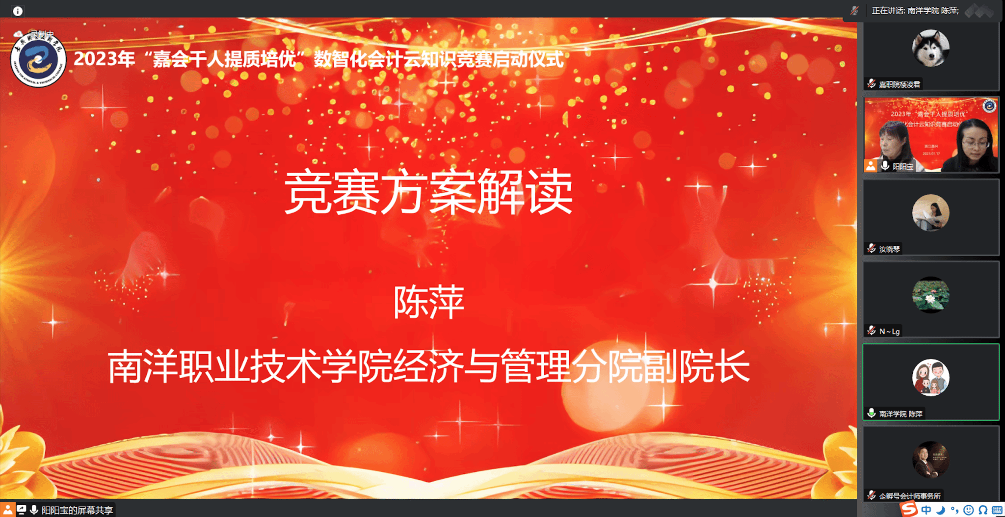 本次云知識競賽啟動儀式特別邀請到了嘉興市會計學會鈕利根會長、嘉興南洋職業技術學院經濟與管理分院陳萍副院長、嘉興南洋職業技術學院質量督導處宋麗娟副處長、嘉興市南湖區代理記賬行業協會會長陳世安以及嘉興職業技術學院現代商貿學院院長周昌紅,大數據與財務管理專業老師和學生代表參加線上會議。