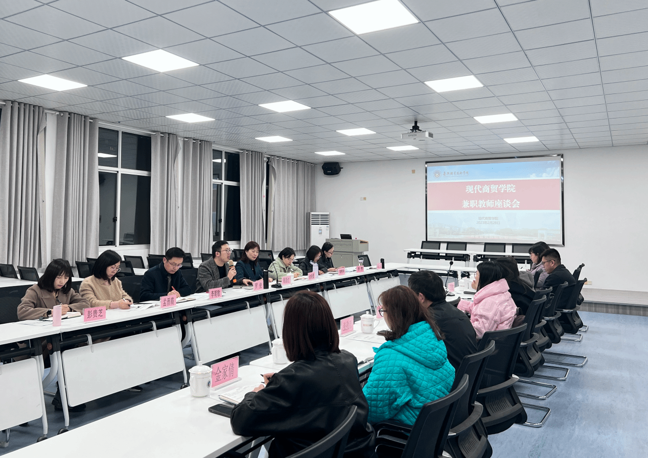 為貫徹落實中共中央、國務院《關于全面深化新時代教師隊伍建設改革的意見》,進一步加強對我院外聘兼職教師的管理,2023年2月28日晚,現代商貿學院召開2022學年度第二學期外聘兼職教師座談會。現代商貿學院院長周昌紅、本學期外聘兼職教師及各教研室主任參加會議,會議由副院長羅俊主持。