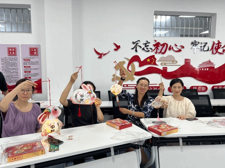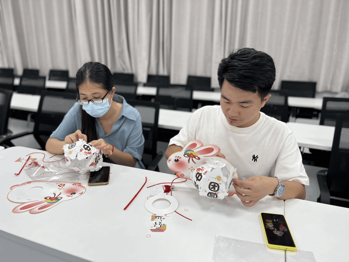 猜燈謎活動后,緊接著開始學習制作兔子燈手工活動。“首先將支架進行卡扣拼接,用膠水固定,再把蠟燭放進燈籠里,緊接著用絲帶連接在燈籠口,最后再用配飾裝飾。”現代商貿學院學工處的鄒其君老師熱情地和大家分享制作心得。在制作過程中,大家分工合作、相互交流,進一步增強了職工的凝聚力,經過一個小時的努力,一盞盞別樣精致、形態各異的花燈展現活動現場?;顒舆^程中,大家體會到了親手制作的樂趣,紛紛拍照留念并表示要將此份喜悅分享給家人朋友,營造了歡樂、喜慶、文明、和諧的節日氛圍。