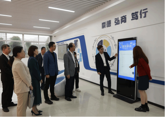 會后,方俊良一行來到現(xiàn)代商貿(mào)學院一樓實訓(xùn)大廳,參觀指導(dǎo)現(xiàn)代商貿(mào)學院數(shù)字貿(mào)易雙創(chuàng)實訓(xùn)中心的基本建設(shè)情況。從LED電子大屏,到現(xiàn)代商貿(mào)學院的文化IP打造、少數(shù)民族學生布吉的創(chuàng)業(yè)夢工坊等數(shù)字化商貿(mào)元素的呈現(xiàn),方俊良書記對現(xiàn)代商貿(mào)學院的快速發(fā)展表示了肯定并指出學院師生一年來用心用情將學院建設(shè)成為一個環(huán)境優(yōu)美精致、書香滿園、學科專業(yè)特色鮮明、建設(shè)成效突出的學院。
