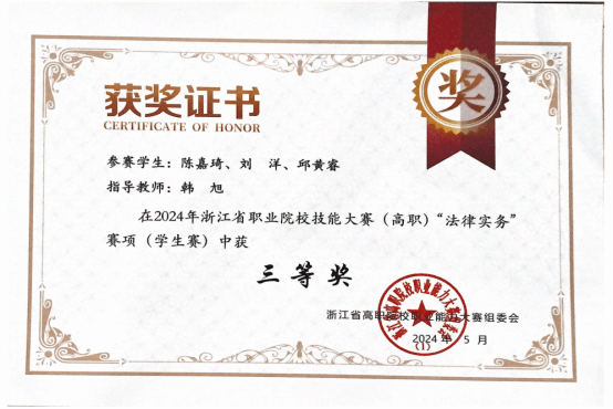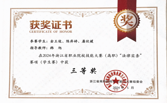 共有來自全省8所職業院校、16支隊伍、48名同學參賽,現代商貿學院國際經濟與貿易專業選派2支隊伍參賽。自2023年10月開始,在專業老師的指導下,參賽學生開始全力以赴投入到緊張的備賽之中,他們克服非法學專業的劣勢,邊學邊練,互相鼓勵,全力以赴奮戰125天,首次獲得了法律職業技能比賽團體三等獎的好成績。