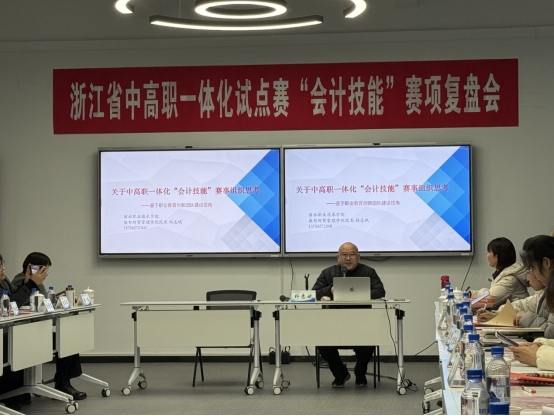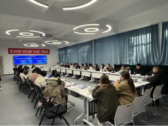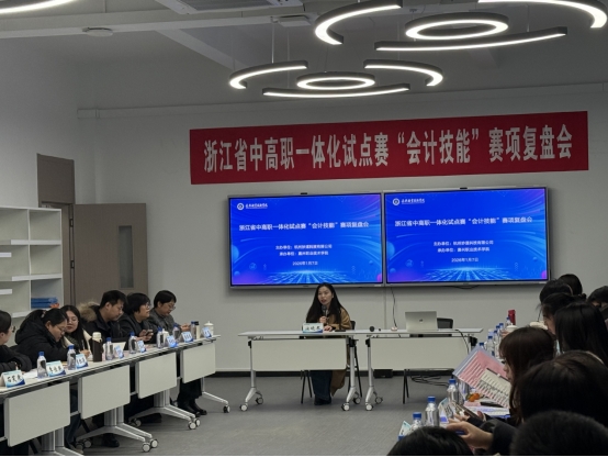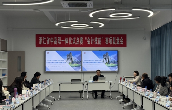 2026年1月7日下午,浙江省中高職一體化試點賽“會計技能”賽項復盤會在我校順利召開。本次會議以全面總結賽事經驗、深化競賽技術內涵、推動賽教深度融合為宗旨,搭建全省中高職院校會計專業(yè)教學與實踐交流平臺,吸引了50余名參賽院校的領隊與指導教師代表齊聚一堂、共研共進。