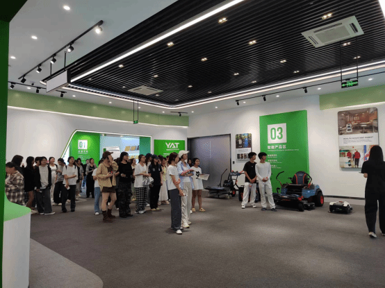 在產(chǎn)品展示區(qū),學(xué)生們透過展示櫥窗和樣機(jī)陳列,觀摩了園林工具、高枝剪、無刷電動(dòng)工具、沖擊扳手等多個(gè)系列的典型產(chǎn)品。講解人員一一介紹各款產(chǎn)品在電壓選型、續(xù)航表現(xiàn)、節(jié)能降噪、耐用性與結(jié)構(gòu)設(shè)計(jì)上的技術(shù)亮點(diǎn),幫助學(xué)生理解產(chǎn)品設(shè)計(jì)與性能之間的關(guān)系。隨后在技術(shù)人員與安全人員的陪同下,學(xué)生們沿線觀察了每一道流程,在生產(chǎn)車間,親眼目睹生產(chǎn)流水線從零部件加工、注塑與金屬?zèng)_壓,到部件輸送、模塊裝配、線路連接、電池安裝、調(diào)試測試,到電氣性能檢驗(yàn)、機(jī)械強(qiáng)度測試、老化試驗(yàn),直至最終封裝、貼標(biāo)、包裝及出貨全部生產(chǎn)過程。在營銷部門,學(xué)生們參觀了營銷工作的任務(wù)展板,了解了產(chǎn)品海外銷售的流程和主要工作內(nèi)容。