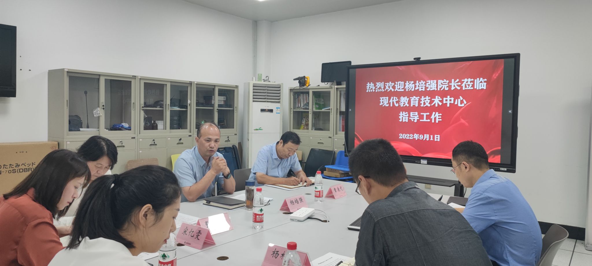 2022年9月1日上午在2号楼107会议室,党委副书记、院长杨培强莅临现代教育技术中心指导工作,党委委员、副院长章康龙陪同调研,会议由中心主任沈权权主持。