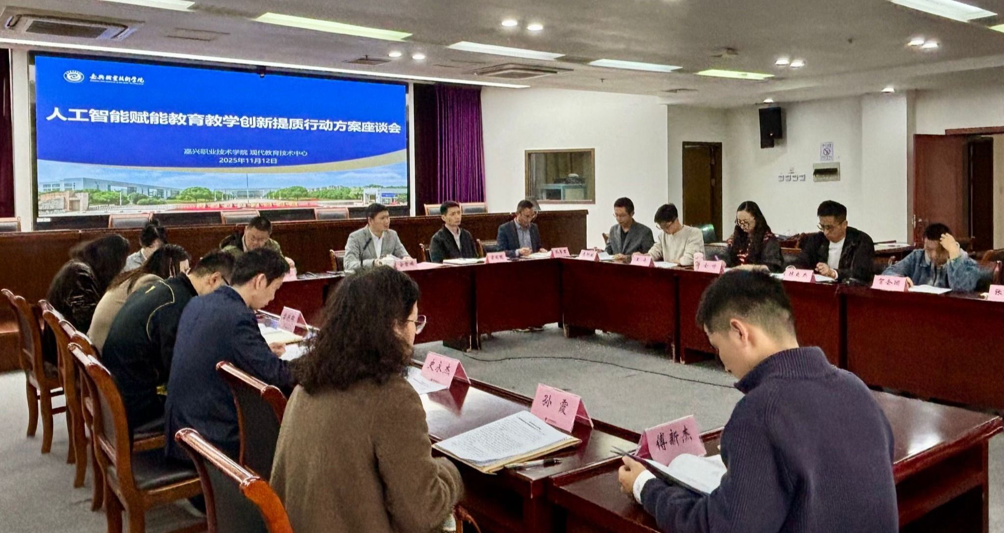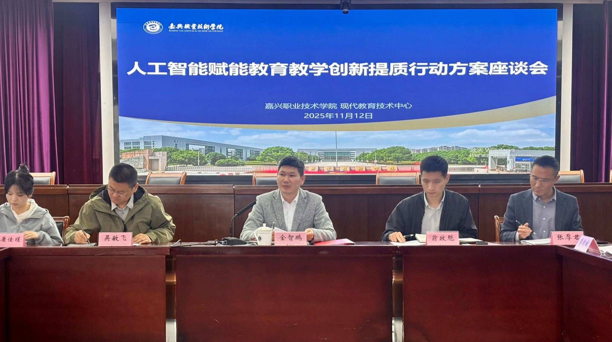 2025年11月12日下午,嘉兴职业技术学院在行政楼506会议室组织召开人工智能三年行动方案座谈会。会议由现代教育技术中心主持,学院党委委员、副院长金智鹏出席并讲话。教务部、组织部等职能部门负责人及各二级学院一线教师参加座谈。