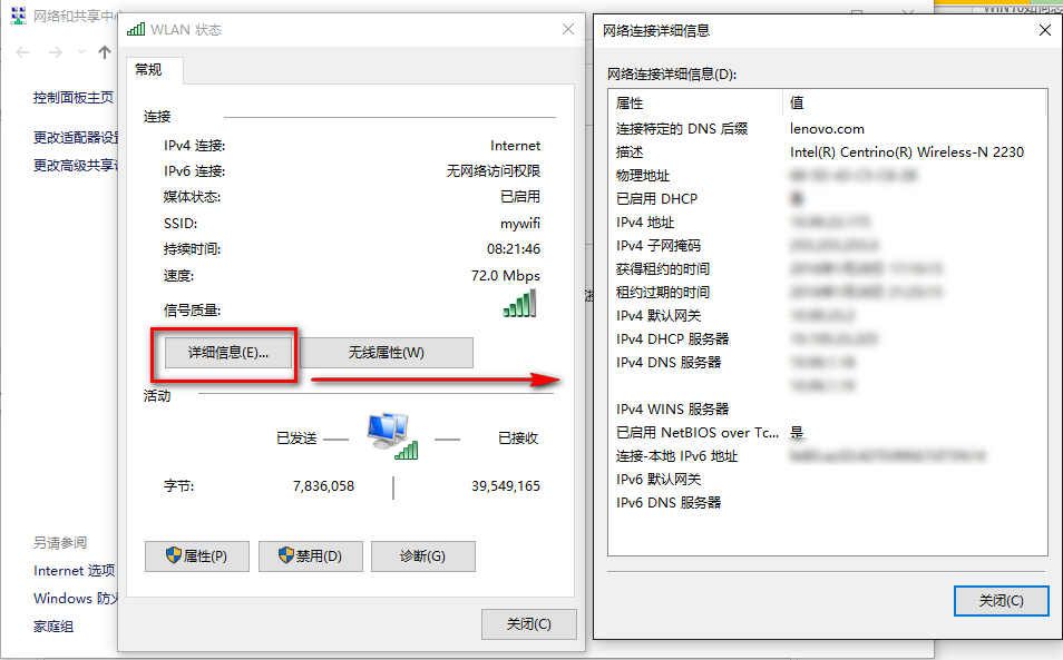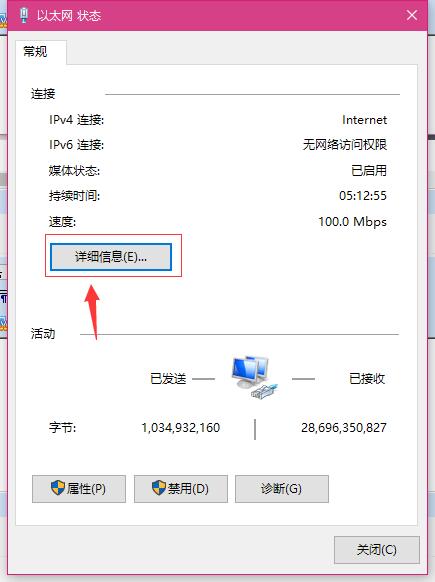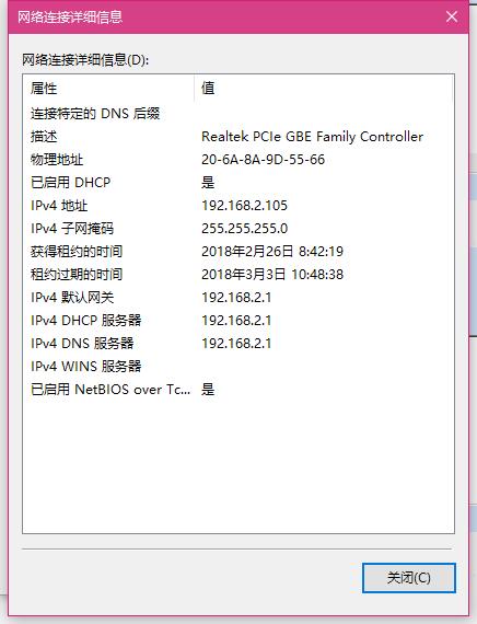 2、查看当前网络连接的IP地址、网关、DNS服务器地址、MAC地址等信息。