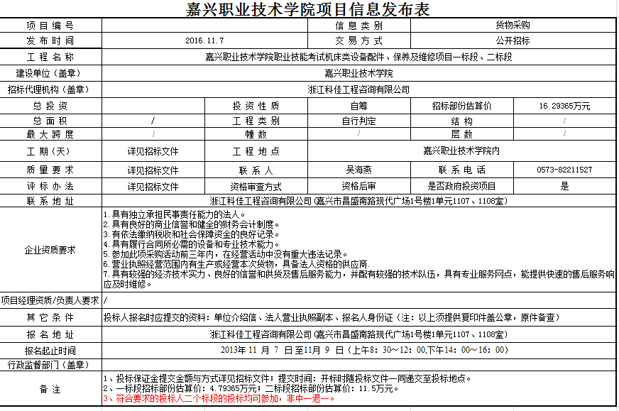 嘉興職業技術學院職業技能考試機床類設備配件、保養及維修項目采購信息發布表