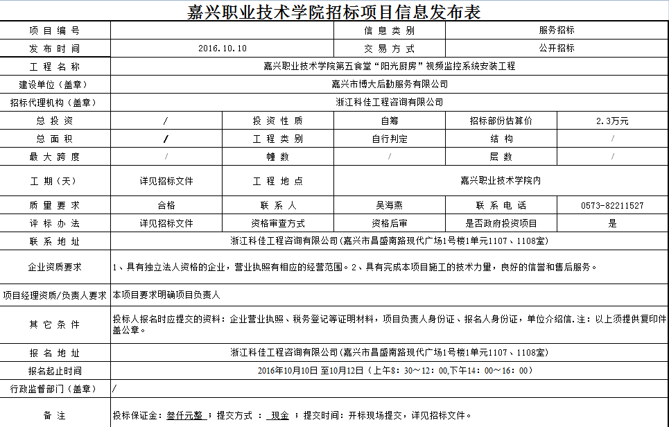 嘉興職業(yè)技術(shù)學(xué)院第五食堂“陽光廚房”視頻監(jiān)控系統(tǒng)安裝工程信息發(fā)布表